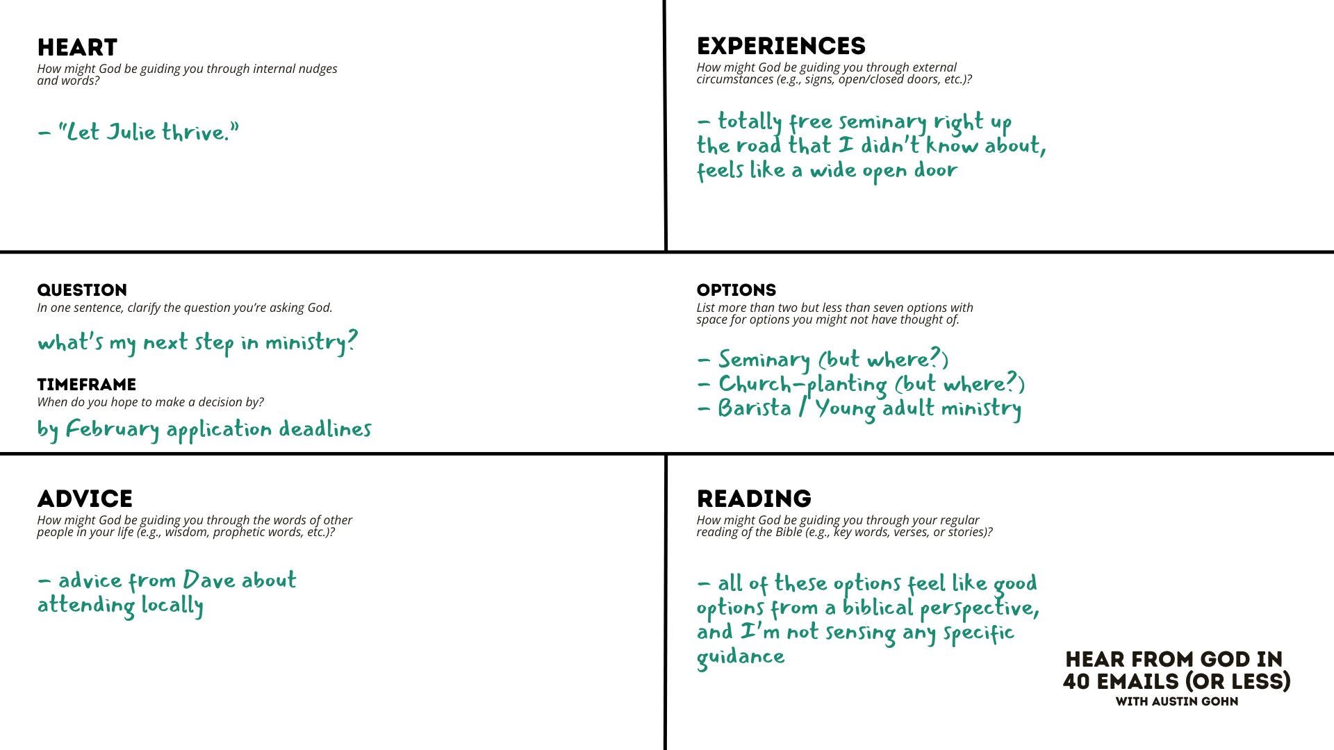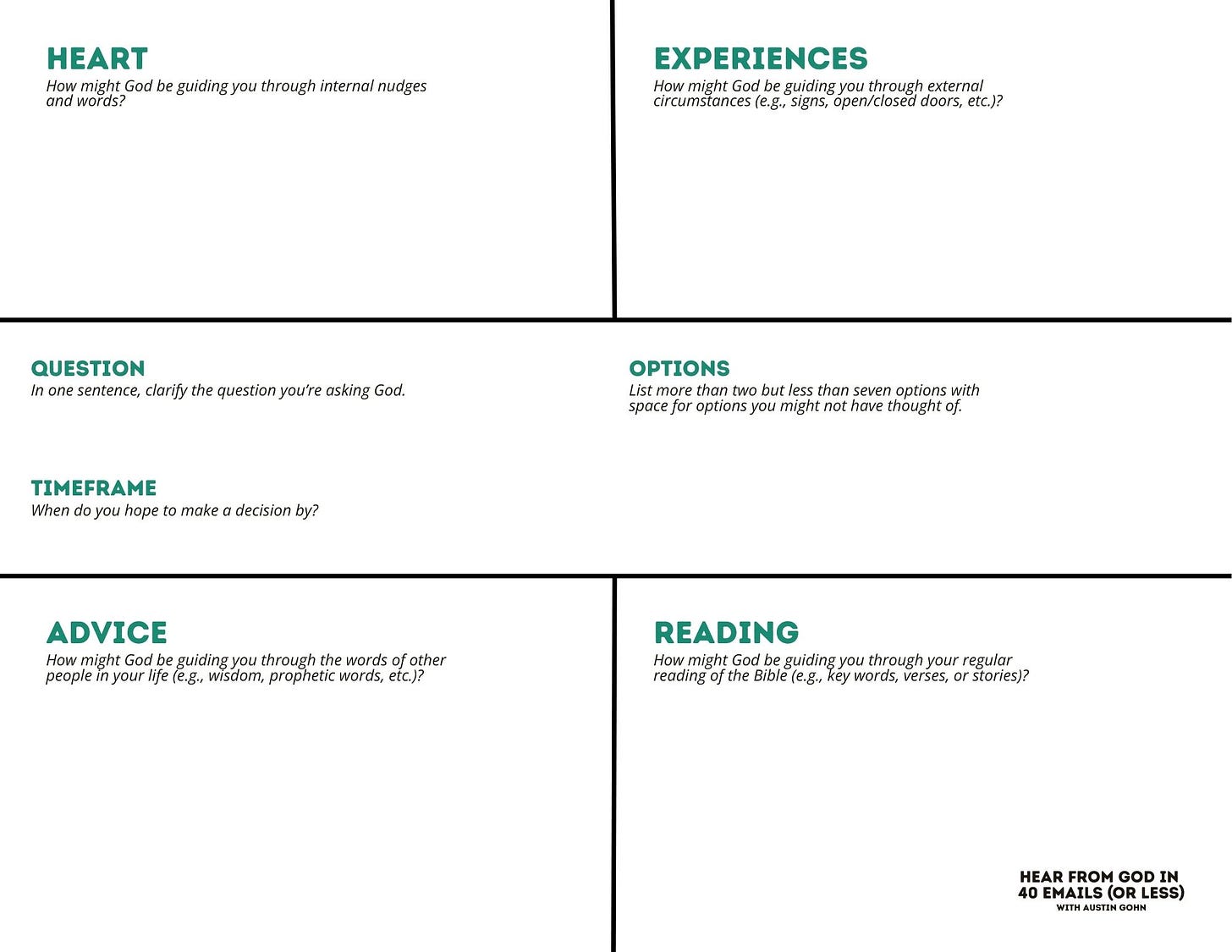 After these steps, you’re in a position to start paying attention and taking note of four different categories of ways that God might be guiding you: Heart, Experiences, Advice, and Reading. It’s not a formula, and God won’t always guide you through all four ways, but they are helpful categories.