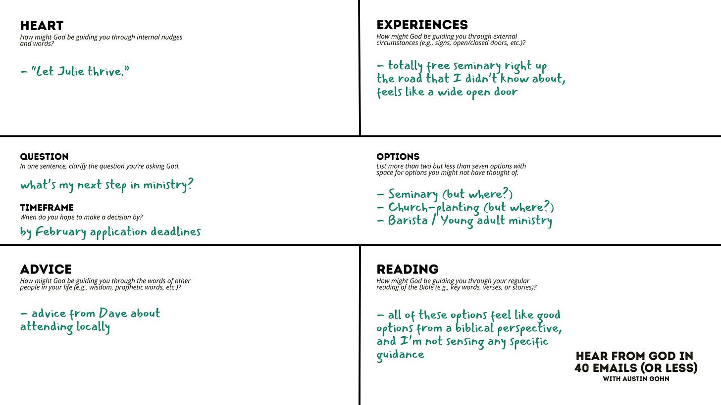 Question: In one sentence, clarify the question you’re asking God. Make sure it’s not too big, too vague, too shallow, or too soon.