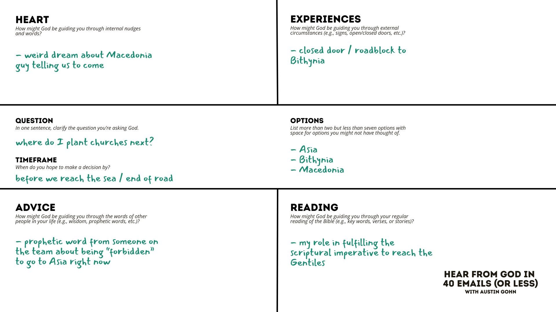 If you’re in a season of decision-making and you’ve been using something like the H.E.A.R. Framework to listen for God’s guidance, you probably have gathered some DIVINE DATA of your own. But, in the end, you still have to make a decision in light of that data about what you’re going to do next—just like Paul and his team did.