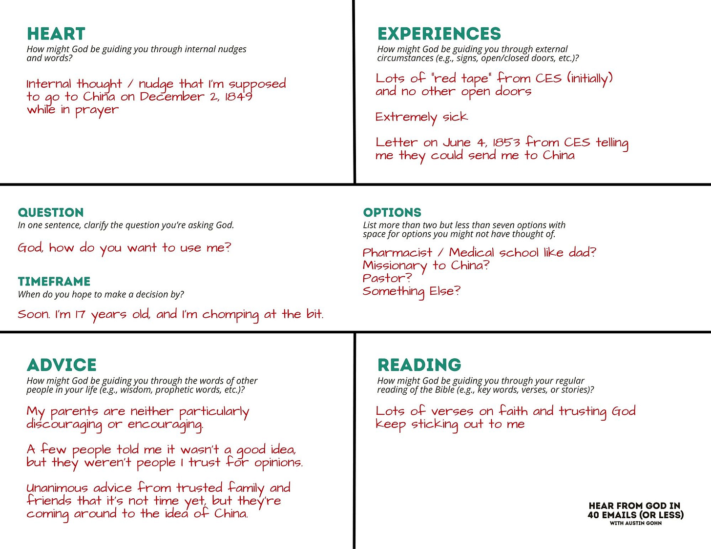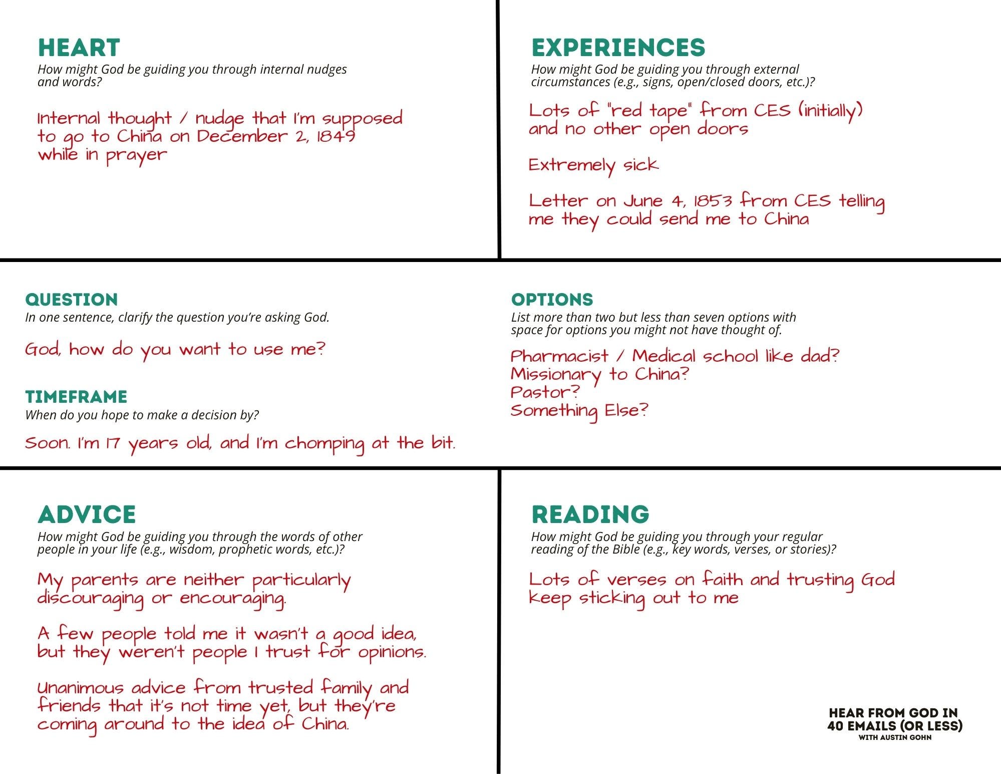 If you subscribe to this Substack, you’ll get a free one-page H.E.A.R. Framework that’s designed to help you discern how God might be guiding you. If Hudson Taylor subscribed this Substack and used this framework, here is a picture of what I imagine it might have looked like:
